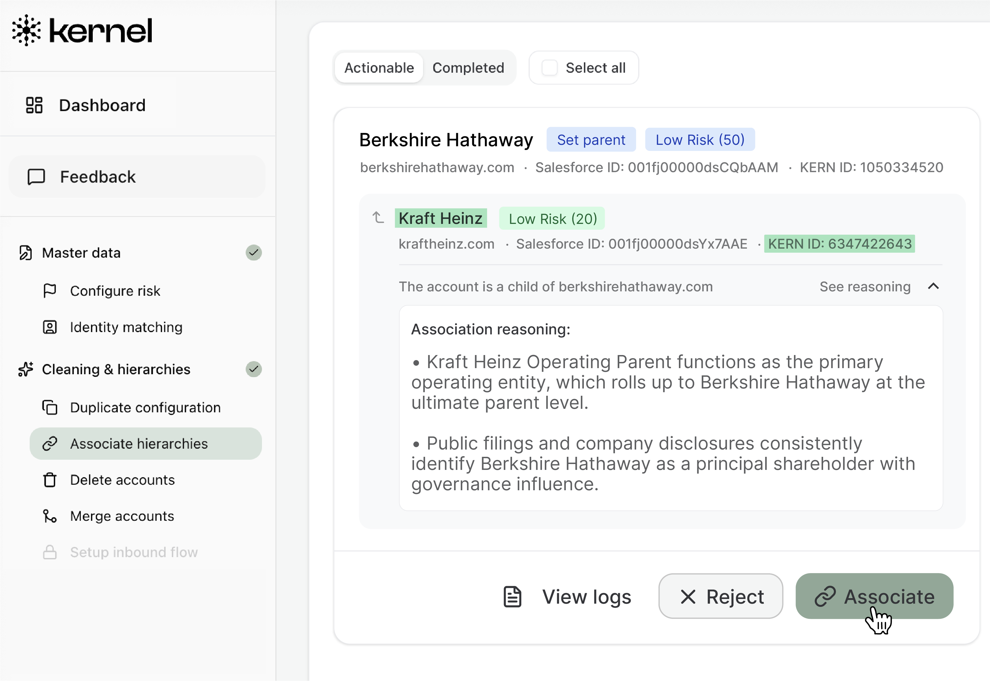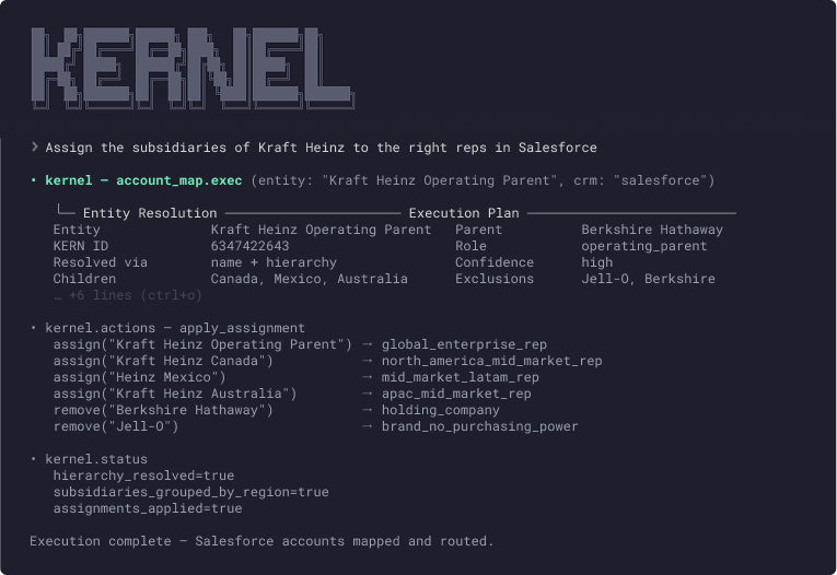 Connect Salesforce to Kernel to map every account to a real-world entity and keep it verified over time.